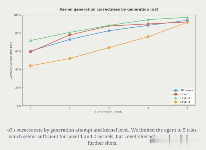 实验表明,正确性会随着尝试次数的增加而提升。以o3为例:第一次尝试就有约60%的概率得到可用实现,到第5次尝试时可用实现比例达到94%。