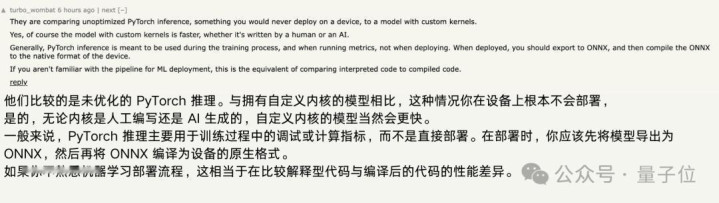 不少眼尖的网友也是发现并指出了这一点:文章里所用的baseline是eager mode,这通常只用于训练调试或指标计算,不会被真正部署到设备上。