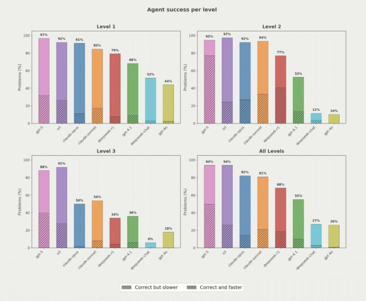 总体而言,GPT-5平均可以带来约20%的加速,其他模型则落后。